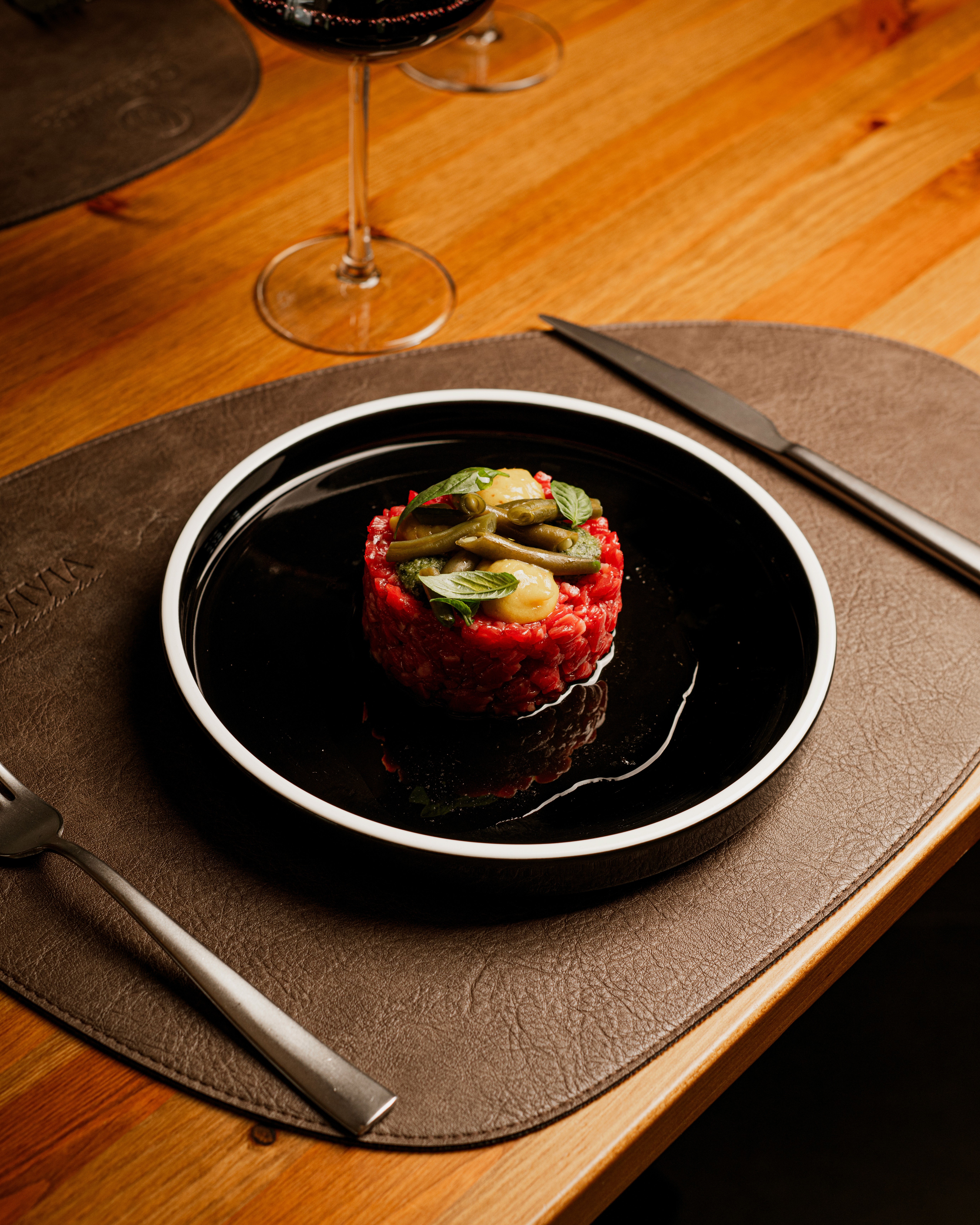 Tartare di frisona avvolta nel lardo e cipolla caramellata
